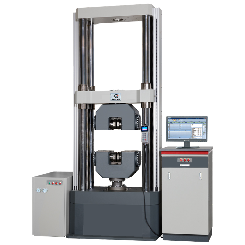 该试验机是双丝杠、四立柱门式结构,试验空间由伺服电机配合高精度滚珠丝杠带动横梁上下移动来自动调整。中横梁和平台之间装有液压控制的平推夹持钳口,标准机型配有V型和平面型钳口用于夹紧圆柱试样和平板试样做拉伸试验。配置可以安装在平推夹持钳口中的上下压板,可以在试验空间内完成各种压缩类试验。